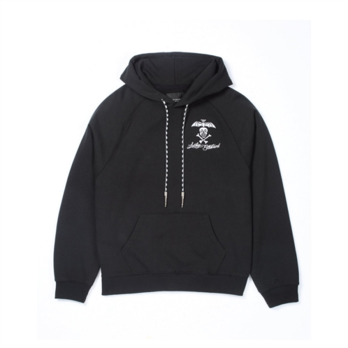 This vintage black heavy-weight french terry pullover sweatshirt features a small embroidery on the front while the back features an oversized design complete with a chainstitch embroidery bat and felt flocking lettering. Each detail of this sweatshirt is meticulously crafted, promising a piece that not only looks great but also feels great to wear. Whether you're hitting the streets, lounging around with friends, or making a statement at your favorite event, this sweatshirt has got you covered.- Pullover- Aux cord draw cords