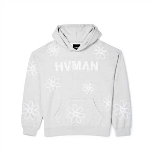 This heather grey heavy-weight french terry pullover sweatshirt features an all over floral embroidery applique and 'Hvman' embroidered with pearl detailing. Each detail of this sweatshirt is meticulously crafted, promising a piece that not only looks great but also feels great to wear. Whether you're hitting the streets, lounging around with friends, or making a statement at your favorite event, this sweatshirt has got you covered.- Pullover