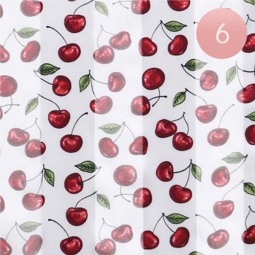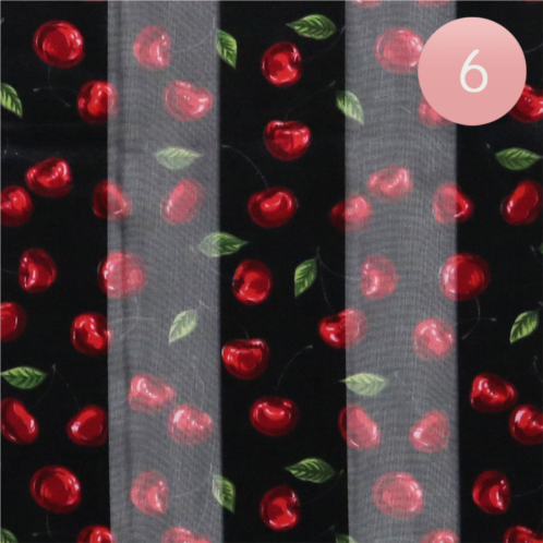 Size - 13' X 60'Material - 100% PolyesterSet of sheer fashion scarves featuring a playful cherry print and soft finish. Ideal for accessorizing outfits with a fun twist, these scarves offer lightweight style and versatility for all-day wear.