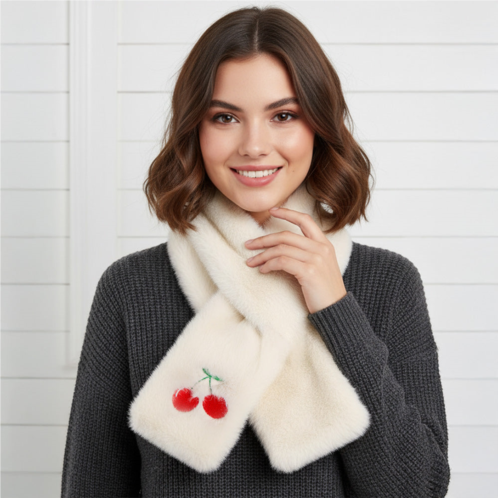 Size - 4' X 34'Cherry Embroidered Faux Fur Scarf Soft, cozy winter scarf with charming cherry detail. Adds playful elegance to your cold-weather look while keeping you warm and stylish. Perfect for festive outfits or everyday wear.