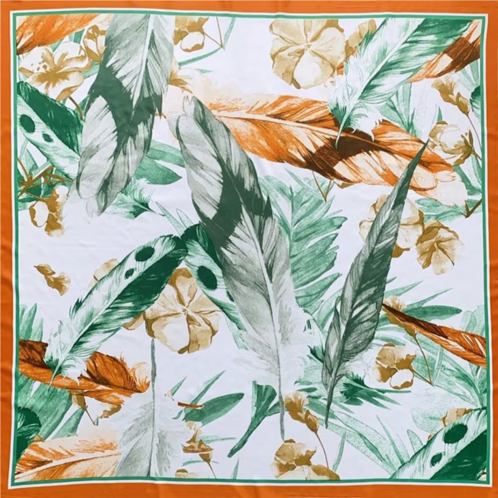 Size - 51' X 51'Material - 20% Silk, 80% Polyester Soft, silky, and lightweight, this scarf features a stunning feather and floral design in earthy green and orange tones. A perfect blend of elegance and nature!