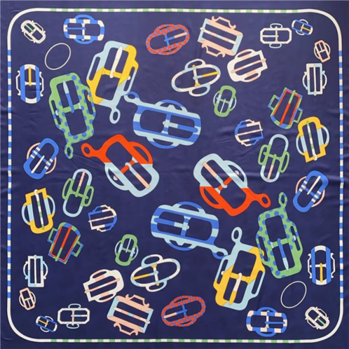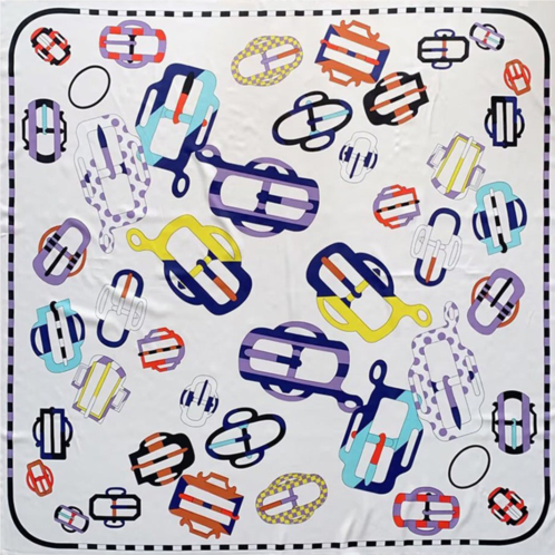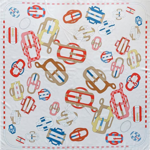 Size - 51' X 51'Material - 20% Silk, 80% Polyester Lightweight and smooth, this silk Feel scarf features a chic buckle-inspired print. The vibrant red, blue, and gold details contrast beautifully against a soft white background, adding a refined yet playful touch to any outfit.