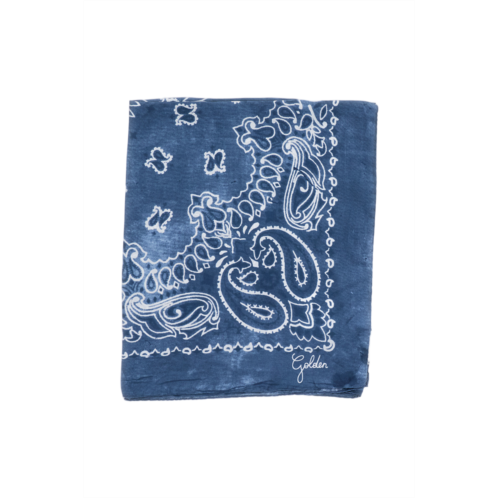A square scarf from Golden Goose features a classic paisley and floral design in white on a deep blue background. Made in Italy from luxurious silk, it provides a soft, smooth feel with a subtle sheen. The edges are elegantly finished, and a discreet signature detail is included in one corner. - Square shape - Paisley and floral pattern - Made in Italy - Luxurious silk material - Soft and smooth texture - Delicate sheen - Elegantly finished edges - Discreet signature detail