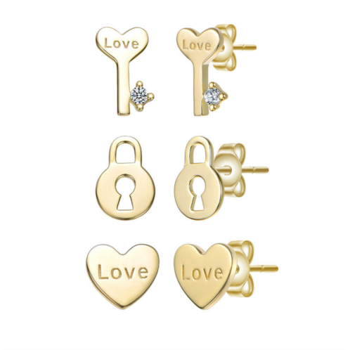 [US] Rachel Glauber sterling silver 14k gold plated with clear cubic zirconia heart key & lock love & lock stud earring 3-piece set