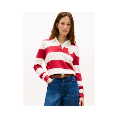 Tommy Hilfiger women's sweater. Our sweater polo is made from a durable knit blend with a hint of wool for lightweight warmth. Rugby stripes and a monogram crest patch add a sporty, preppy touch.