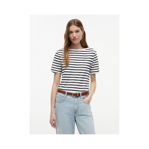 Tommy Hilfiger women's T-shirt. Our tee is made from lightweight cotton interlock with a smooth, two-sided construction that is durable and exceptionally soft. Gold-tone shoulder buttons and metallic embroidery at the chest add an elevated finish.