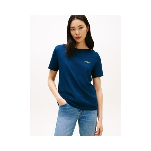Tommy Hilfiger women's T-shirt. Our tee is made from lightweight cotton interlock with a smooth, two-sided construction that is durable and exceptionally soft. Gold-tone shoulder buttons and metallic embroidery at the chest add an elevated finish.