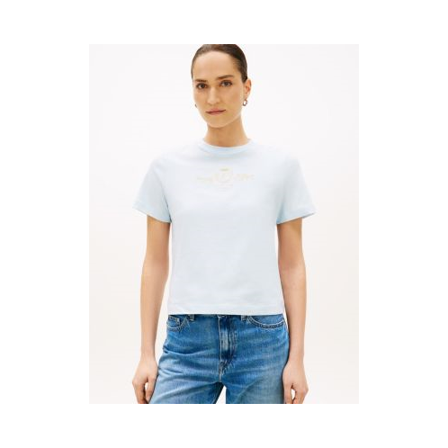 Tommy Hilfiger women's T-shirt. Our tee is cut in a comfortable, flattering fit from soft and stretchy cotton jersey. This version is finished with our embroidered club crest logo with a gold-tone metallic finish for an elevated look.