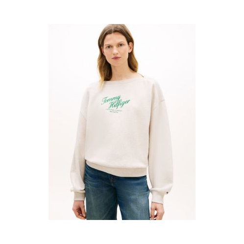 Tommy Hilfiger women's sweatshirt. Deigned with a flattering boatneck, our script logo sweatshirt is made from high-pile cotton terry with a subtle, fluffy texture and soft feel. Cut in a relaxed fit, it is an easy, comfortable layer.