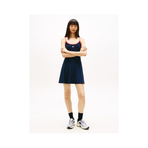 Tommy Hilfiger women's dress. Our mini dress is made from comfortable stretch cotton with a soft ribbed finish. Designed in a flattering skater silhouette, it features slim straps, a fitted waist and a flared skirt. Part of our Tommy Jeans collection.