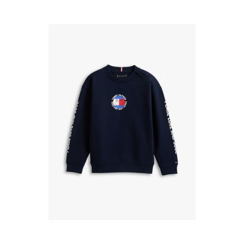 Tommy Hilfiger boys' sweatshirt. This comfy terry sweatshirt is designed in a slouchy relaxed fit and features our peace and love flag logo at the chest and arms. Part of our Adaptive Collection, designed for ease of dressing in classic Tommy style.