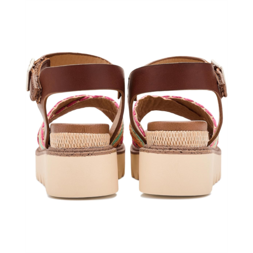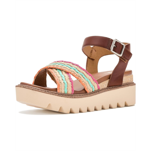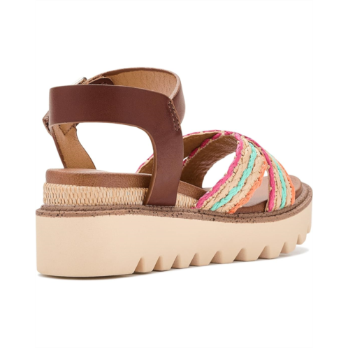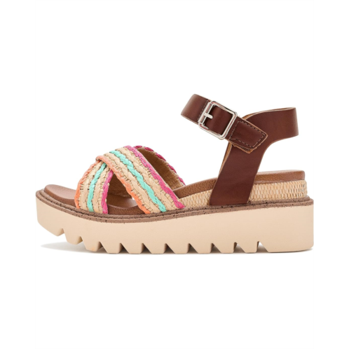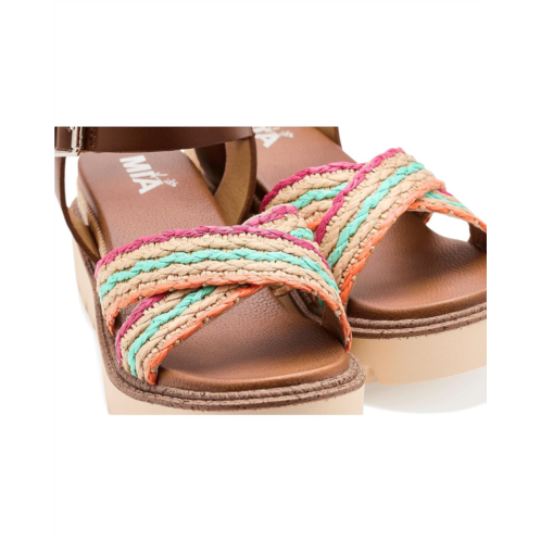 - The Mia Kids Zhella Sandal blends comfort and style in a single package. The open round-toe sandal is crafted with a faux leather upper with woven raffia textile multicolored front straps and an ankle strap with buckle closure for easy adjustability. The faux leather lining and burnished polyurethane insole add to the comfort, while the wedge heel elevates the height.