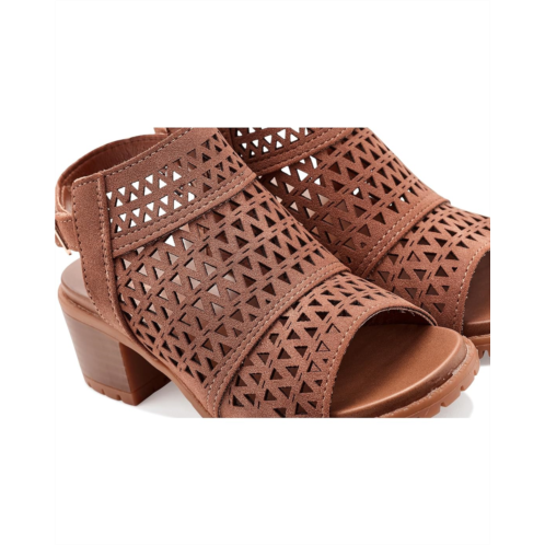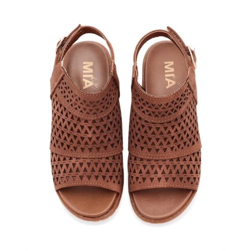 - Take every step forward with comfort and confidence wearing the Mia Kids Mollee Sandals. Crafted with a faux leather upper with allover intricate cut-outs and an adjustable ankle strap & buckle closure, this elevated block heeled sandal is the perfect accessory to complete your outfit!