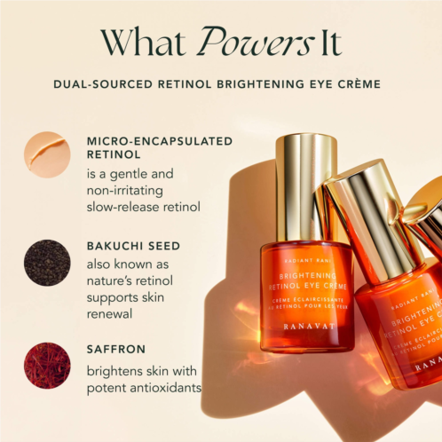 What it is:An eye cream that is powered by dual-sourced micro-encapsulated retinol with bakuchi seed plus antioxidant saffron.