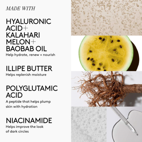 - Hyaluronic Acid, Kalahari Melon, and Baobab Oil: Help hydrate, renew, and nourish the skin.