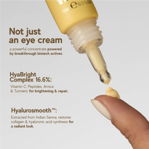 - HyaBright Complex: Custom blend of niacinamide, vitamin C, and turmeric to visibly brighten under-eyes.
