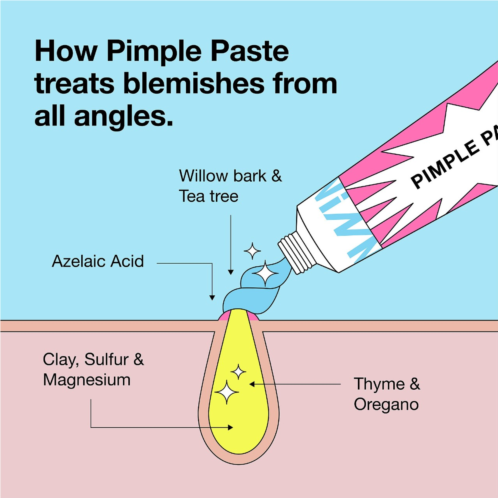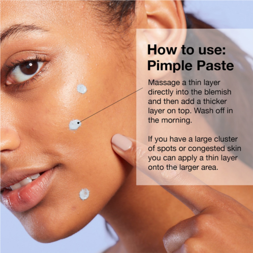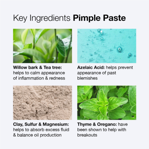 What Else You Need to Know: Pimple Paste Overnight Blemish Drying Paste is an alcohol-free drying paste powered by natural ingredients that are clinically proven to be more effective than their synthetic alternatives. Willow bark, sulfur, clay, azelaic acid, tea tree, oregano, thyme, and vitamin C work to fight and fade the look of blemishes. Pimple Paste will not rub off on your pillow.