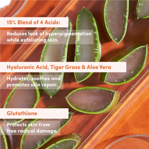 - 15% Blend of Azelaic, Glycolic, Lactic, Tranexamic Acids: Reduces look of hyperpigmentation and dark spots while exfoliating skin.