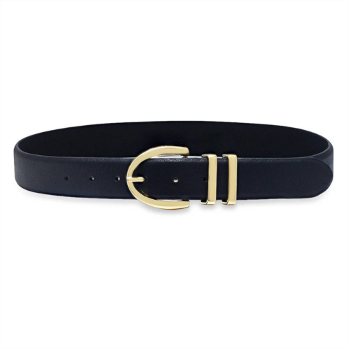 Upgrade your accessory game with this stylish and versatile belt that will tie any outfit together. This must-have accessory is classic in its design and will never go out of style.Introducing the Women's Palisades Belt by Laurel and Gold, crafted from genuine leather and designed to enhance any outfit with a touch of class. This belt features a feathered edge and measures 1 3/8 inches in width. It offers five holes for adjustable sizing to ensure a perfect fit. Closure type - Buckle, in a sophisticated black and gold combination.