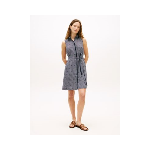 Tommy Hilfiger women's dress. Made from fluid crepe with an effortless drape, our sleeveless shirtdress features a self-tie belt to customize the fit. The TH monogram grid print gives it a signature, elevated look.