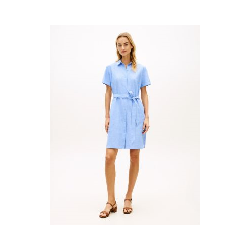 Tommy Hilfiger women's dress. Our short-sleeve shirtdress is made from a light, breathable cotton-linen blend for ultimate comfort in the warmer months. Simply detailed for versatile styling options, it features a spread collar, button closures and a self-tie belt.