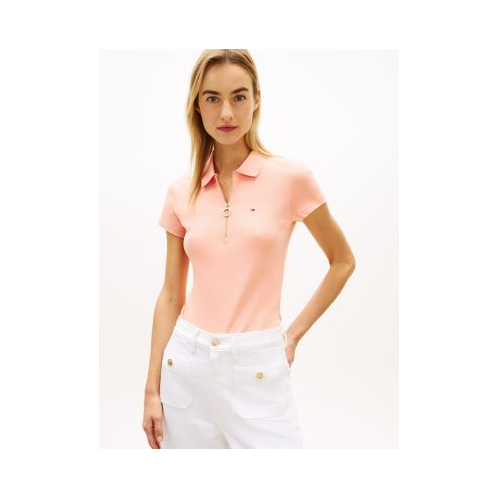 Tommy Hilfiger women's polo. Designed in a trim fit from premium cotton, this short-sleeve polo has an elevated feel, thanks to the gold-tone zip placket.