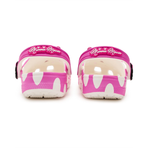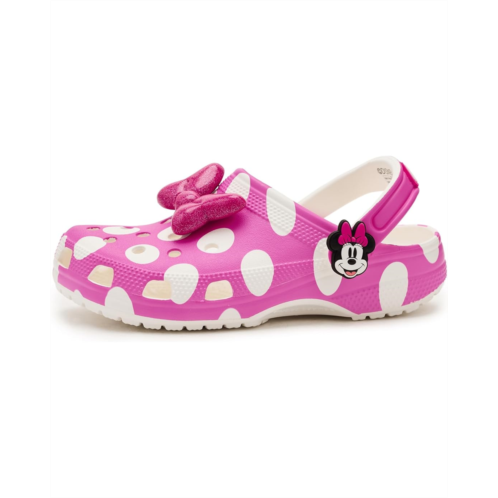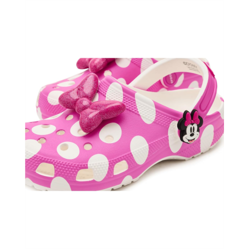 - Yoo-hoo, it's the Minnie Mouse Classic Clog from the Disney's Mickey & Friends collection from Crocs Kids! This adorable Classic Clog is designed with Minnie Mouse's iconic style in mind, featuring a pink polka dot print topped with a big, pink, glitter bow on each shoe! Minnie Mouse's face adorns each of the rivets with her signature across the backstrap.