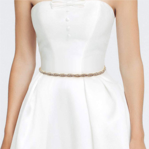 Size - 0.4' H, 24.5' + 18' LDelicate crystal-embellished waist belt designed to enhance bridal or formal gowns. Features a refined twisted design and adjustable fit for added elegance and sophistication.