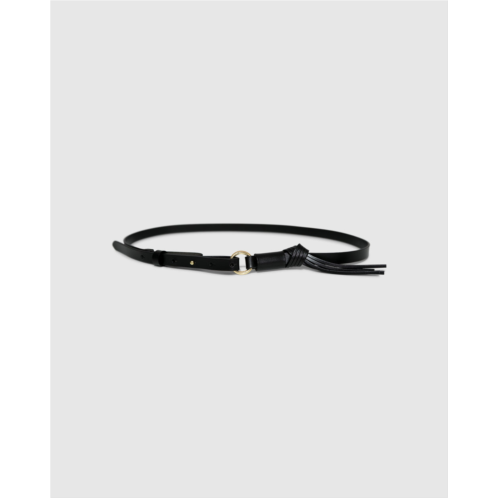 Sleek, minimal, and with just the right amount of flair. This slim leather belt features a polished gold ring closure and a knotted tassel detail that adds movement and edge. A versatile piece to elevate both casual and refined looks.