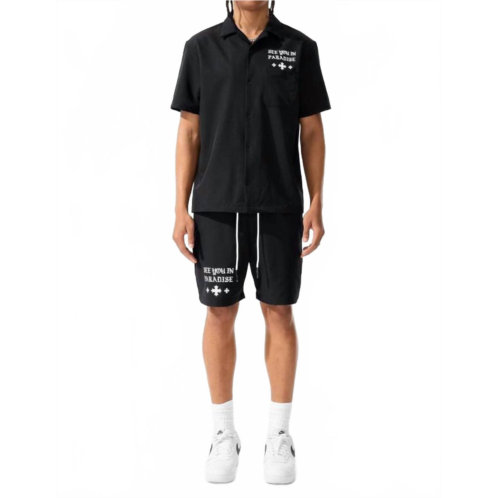 The Mechanic Set by See You In Paradise offers a trendy streetwear look in a chic cream color. The short sleeve Mechanic Shirt features a five-button closure, a pocket with flap entry on the left chest, and a striking screen print across the front, sleeve, and back. Made from 92% Polyester and 8% Spandex, it promises breathable comfort. Accompanied by retro shorts with a 7.5' inseam, these also feature dual side pockets, a back wallet pocket, and rubber-tipped adjustable drawstrings for a perfect fit, making it a must-have for your vacation wardrobe.