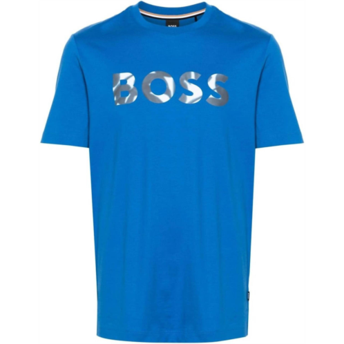 Introducing the Men's Thompson Tee by Hugo Boss, a stylish blue tee featuring a classic crewneck and short sleeves. Made from 100% cotton, this regular fit tee is designed for comfort and breathability, complete with a logo on the front. Closure - Pull on. Care - Machine wash and tumble dry.
