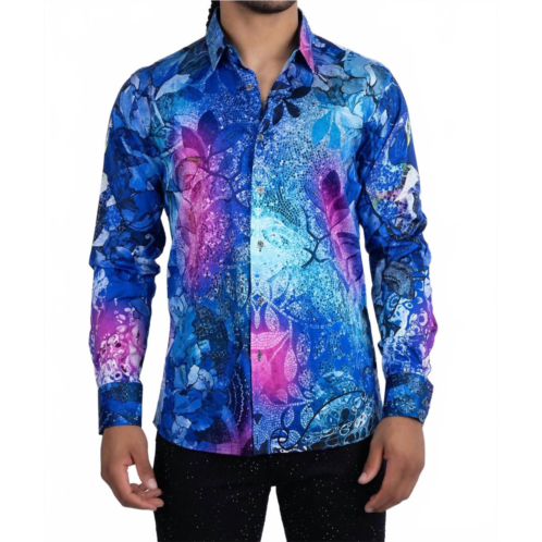 Introducing the Roma Peacock Long Sleeve Shirt by BARABAS, an eye-catching addition to your wardrobe with its unique floral, mosaic, and watercolor prints. This blue cotton blend shirt boasts striking long sleeves and a classic collared neckline, perfect for making a bold statement. The button closure complements its daring design, while the 97% Cotton and 3% Spandex composition ensures comfort and style. Care instructions include machine washing in medium settings, washing deep colors separately, and warm ironing for optimal garment care.