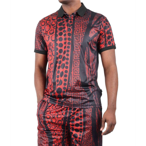 Introducing the BARABAS Mania Mod Polo Shirt, a standout piece for those seeking stylish sophistication. This short-sleeve polo in striking red showcases Barabas' original Greek Key and polka dot pattern, offering a unique Baroque look perfect for any formal occasion. Crafted from a lightweight blend of 95% regenerated fabric and 5% spandex, it features a ribbed collar and cuffs alongside a classic 3-button closure. Care for this garment by following the recommended dry-cleaning instructions for long-lasting appeal.