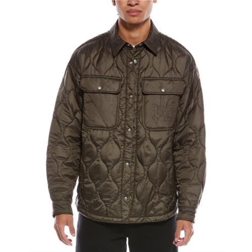 Introducing the Palm Angels Classic Logo Quilted Jacket, a stylish and functional addition to any man's outerwear collection. This military-inspired jacket features dual chest pockets and side slip pockets for added convenience. The snap closure makes it easy to put on and take off, while the 100% polyester construction ensures durability and comfort. Machine washable for easy care, this jacket measures approximately 29 inches from shoulder to hem. Whether you're running errands or heading out for a night on the town, this Palm Angels jacket is sure to keep you looking cool and feeling warm. Model is 6'1 and is wearing a size medium. Measurements may vary slightly by size.