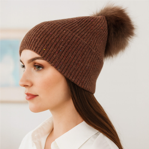 [US] FASHNZFAB faux fur pom sparkly ribbed knit winter beanie hat