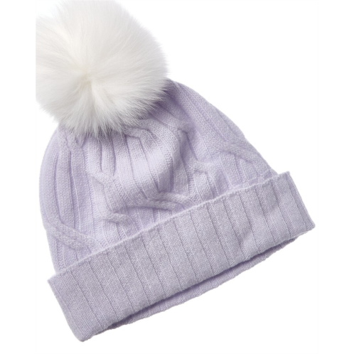 Introducing the Hannah Rose Wide Cable Cashmere Hat, a must-have accessory for the fashion-forward woman. Crafted in luxurious 100% cashmere, this hat features a wide cable detail and wide rib cuff for added style. The fox fur pom adds a touch of elegance to this chic and cozy hat. Perfect for staying warm and looking fabulous during the colder months. This grey hat is the perfect addition to any winter wardrobe. Imported and dry clean only. Please note that all measurements are approximate. Add a touch of sophistication to your winter look with the Hannah Rose Wide Cable Cashmere Hat.