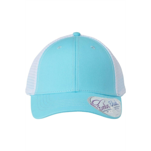 100% cotton printed micro canvas. 100% polyester mesh. Structured, six-panel, mid-profile. Pre-curved visor, matching undervisor. Elude makeup resistant, breathable, moisture-management sweatband. Evolve concealed ponytail opening. Plastic snapback closure.