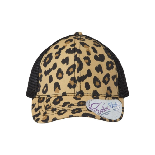 100% cotton printed micro canvas. 100% polyester mesh. Structured, six-panel, mid-profile. Pre-curved visor, matching undervisor. Elude makeup resistant, breathable, moisture-management sweatband. Evolve concealed ponytail opening. Plastic snapback closure.