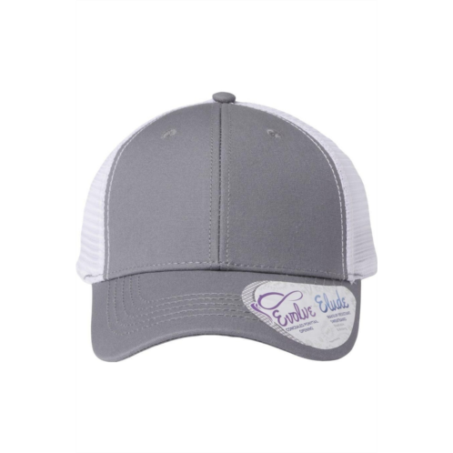 100% cotton printed micro canvas. 100% polyester mesh. Structured, six-panel, mid-profile. Pre-curved visor, matching undervisor. Elude makeup resistant, breathable, moisture-management sweatband. Evolve concealed ponytail opening. Plastic snapback closure.