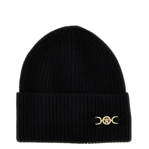 Versace Ladies Hats. Fashion category - Hats. SKU - 1007514-1A10149-BLACK. Color - Black. Versace Medusa 95 Medallion Knit Beanie. This beanie features a plush wool and cashmere blend in a rib-knit design, elegantly accented by a Medusa '95 hardware, adding a touch of timeless luxury to its cozy, refined silhouette. 70% Wool, 30% Cashmere. Made in Italy.