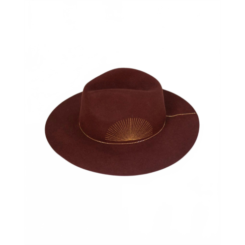 Turn heads in this stylish and chic hat. Not only is this accessory a must for keeping the sun out of your face, it will also be the perfect complement to any cute warm-weather outfit.The Van Palma Women's Basile Hat in burgdy is a unique piece, meticulously handcrafted for an authentic and precious appearance. Made from 100% wool felt, this hat is adorned with an exquisite embroidery sun and a gold plated chain. It features an edge width of 8 cm and a head height of 10 cm, along with a water-repellent treatment. This artisanal creation adds a touch of elegance to any outfit.