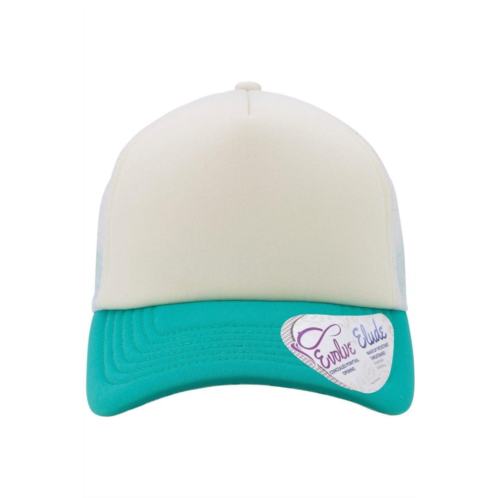 100% polyester foam front panels, mesh back panels. Structured, Five-panel, high profile. Slightly-curved visor, pattern undervisor. Elude makeup resistant, breathable and wicking sweatband. Evolve concealed ponytail opening. Plastic snapback closure.