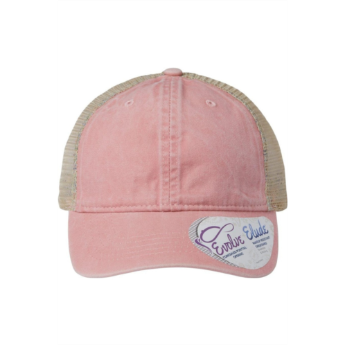 100% cotton pigment-washed twill. 100% soft polyester mesh. Unstructured, six-panel, low-profile. Pre-curved visor, pattern undervisor and seam tape. Elude makeup resistant, breathable, moisture-management pattern sweatband. Evolve concealed ponytail opening. Plastic snapback closure. This product meets the following Sustainable Style subcategory - Sustainable Materials - Contains 100% BCI cotton.