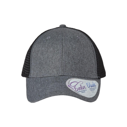 100% cotton printed micro canvas. 100% polyester mesh. Structured, six-panel, mid-profile. Pre-curved visor, matching undervisor. Elude makeup resistant, breathable, moisture-management sweatband. Evolve concealed ponytail opening. Plastic snapback closure.