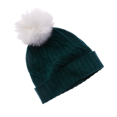 Introducing the 'Hannah Rose Wide Cable Cashmere Hat' in the stunning Wild Wood color pattern. This luxurious hat is crafted with 100% cashmere, offering both warmth and elegance. The wide cable detail and wide rib cuff add a unique touch to this classic piece, while the fox fur pom pom on top adds a touch of glamour. Measuring at 10.5 inches in length, this hat is the perfect accessory for the colder months. Made with the highest quality materials, this hat is recommended to be dry cleaned only. Imported and designed with attention to detail, this hat is sure to elevate any winter outfit with its fresh and feminine aesthetic. Please note that all measurements were taken by hand and are approximate; slight variations may occur. Elevate your winter wardrobe with the Hannah Rose Wide Cable Cashmere Hat.