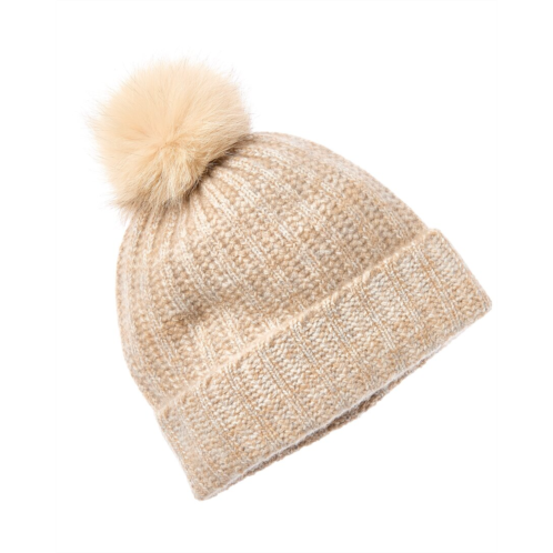 Stay cozy and stylish with the Amicale Cashmere Marl Ladderstitch Cashmere Hat. Made with 100% cashmere, this luxurious hat features a natural color/pattern and a fur pom design detail made with dyed fox from Finland. Measuring 8.5 inches from the top of the head to the hem, this imported hat is the perfect accessory for staying warm during the colder months. Please note that all measurements were taken by hand and are approximate, so slight variations may occur. Dry clean only to keep this hat looking its best.