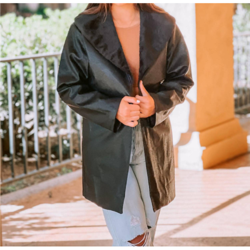 Soft leather, impeccable design. This leather jacket is a win-win.Elevate your winter wardrobe with the Black Sherpa Coat by Blue Blush, a stylish fusion of edgy faux leather and plush sherpa. Featuring long sleeves and a chic faux fur collar, this coat is composed of 55% Cotton and 45% Polyurethane, providing both comfort and modern elegance. With a flattering 20' garment length, functional pockets, and a waist-cinching tie belt, it is as practical as it is stylish. Care for this solid-patterned piece with hand wash and line dry instructions, making it a must-have addition to any collection.