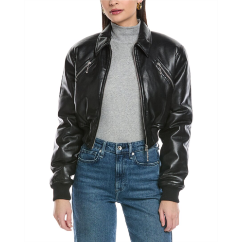 Introducing the 'NANUSHKA Myrto Ribbed Cropped Jacket' for women's outerwear. This stylish jacket comes in classic black, featuring zippered front pockets and rib knit trim for added detail. With a zipper closure and a length of approximately 18.5 inches from shoulder to hem, this jacket is both fashionable and functional. Made with a shell of 100% polyurethane coated polyester, a middle layer of 80% polyester and 20% nylon, and a lining of 100% viscose, this jacket is high quality and luxurious. Perfect for a night out or a casual day, this jacket is sure to become a staple in your wardrobe. Dry clean only. Imported. Model is 5'9 and is wearing a size XS. Measurements may vary slightly by size.