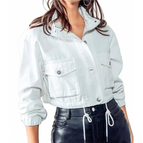 The perfect jean jacket for those slightly crisper days between seasons.Introducing the Utility Cropped Denim Jacket by Urban Daizy, a must-have for any modern wardrobe. This women's jacket features long sleeves with a button closure and a fashionable standing collar, offering a chic look for the Spring season. Made from solid white denim, it includes functional pockets to balance style with utility. Care is easy with machine wash instructions, making it an ideal choice for travel and everyday wear.