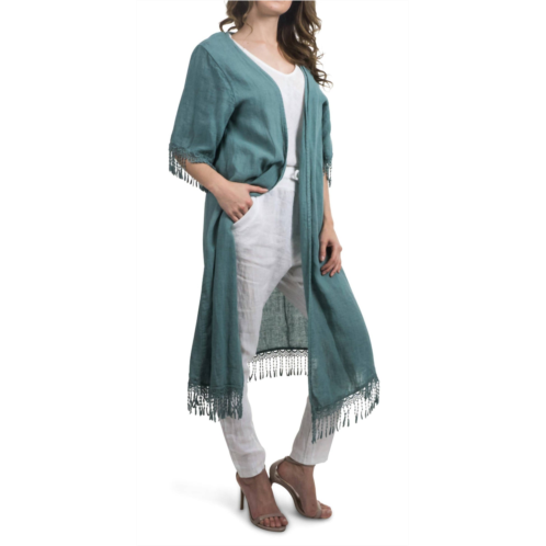 A casual yet cool jacket that every closset needs.Elevate your fall wardrobe with the Barbara Open Front Jacket by GIGI MODA, crafted from a blend of 75% linen and 25% cotton in a textured green finish. This Italian-made jacket features elegant elbow sleeves adorned with fringe embroidery, adding a sophisticated touch to your travel-ready attire. Designed for easy layering, this casual piece has a pull-on closure and a one-size-fits-most construction. Care for this chic jacket by hand washing and laying flat to dry, ensuring it remains a staple for seasons to come.